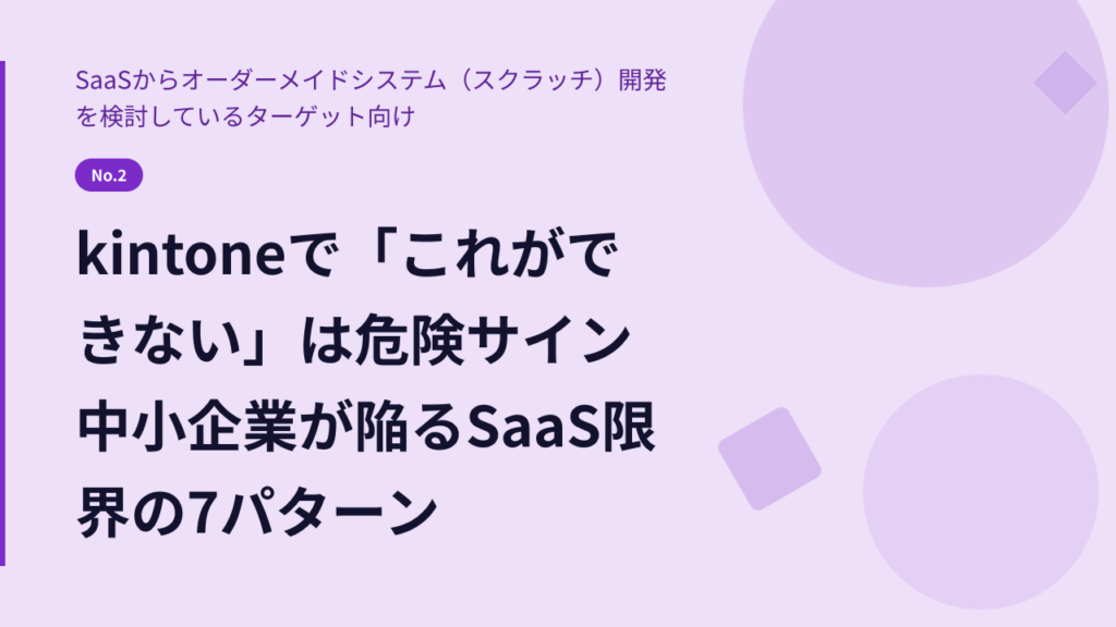 この記事では、中小企業がkintone運用で直面しやすい「SaaSの限界」を7つのパターンに整理して解説します。あわせて、自社がどの状態にあるのかを確認できるチェックリストと、次に取るべき選択肢も紹介します。
