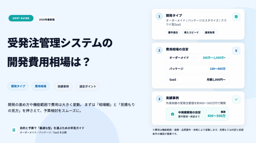 受発注管理システムの開発を検討しているものの、「どのくらいの費用がかかるのか見当がつかない」とお悩みではないでしょうか。開発の進め方や機能の範囲によって費用は大きく変わるため、まず全体の相場観を把握しておくことが重要です。