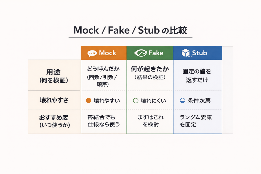 - Stub(スタブ):固定値を返すだけの差し替え(時刻やトークン生成など)