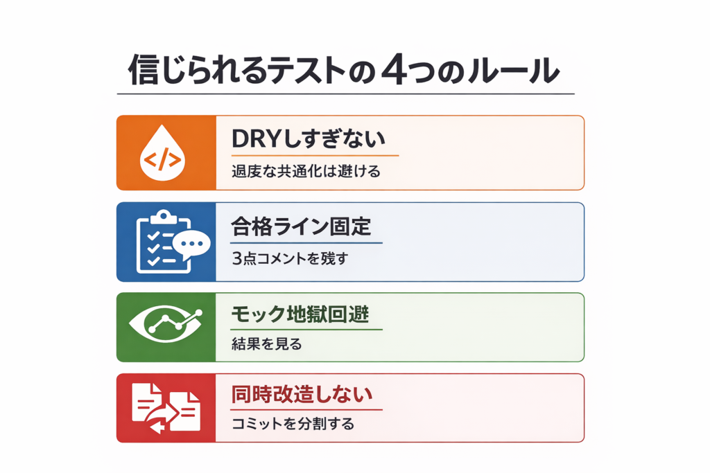 4. 実装とテストを同時に大改造しない(合格ラインのすり替え防止)