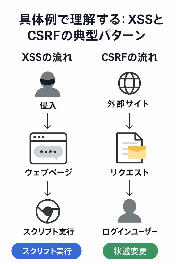 • XSS:ブラウザで不正スクリプトが動く(表示の安全性)→ 対策は出力時エスケープが中心